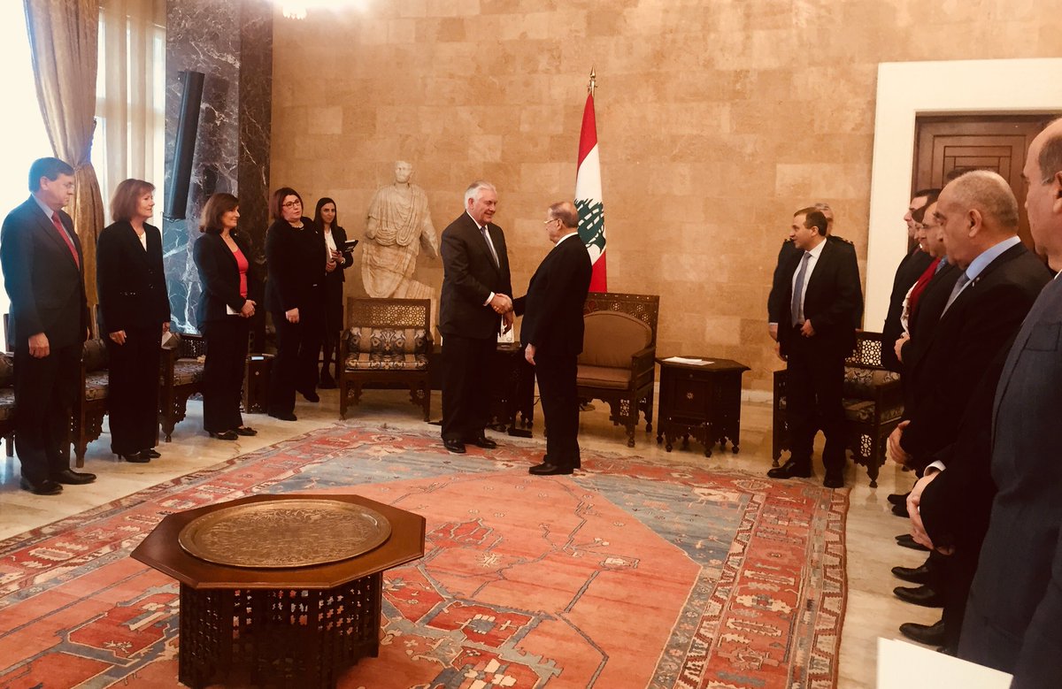 El secretario de Estado de los Estados Unidos, Rex Tillerson, se reunió con el Presidente de la República, Michel Aoun, y el ministro de Relaciones Exteriores y Emigrados, Gebran Bassil, en el Palacio de Baabda, afirmando el apoyo de EEUU a la estabilidad y continua prosperidad de Líbano como así también al ejército libanés .