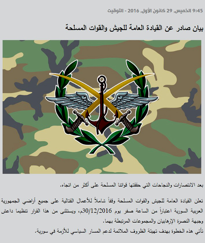Anunciado por el ministerio de Defensa sirio para las 0 horas del 30 de diciembre, se acordó entre Damasco y grupos armados y abarca todo el territorio nacional. No incluye a los terroristas Frente Al Nusra y DAESH (E.I.).