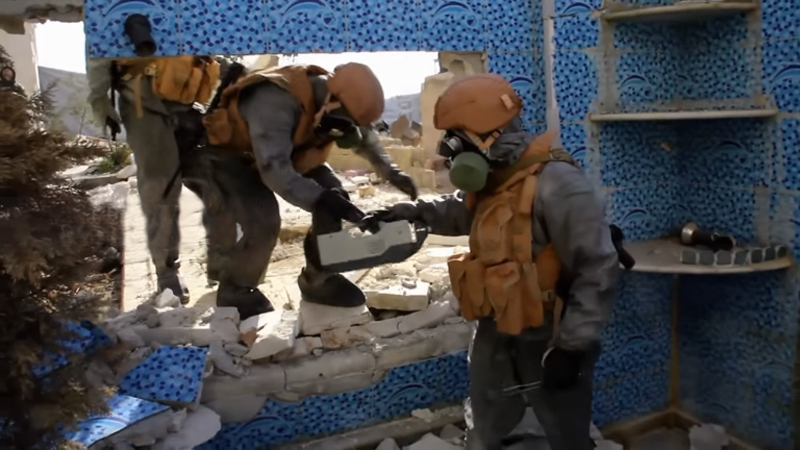 Según dijo un representante de la división “Hemos arribado al barrio 1070, para tomar muestras in situ. Hemos recolectado muestras del interior de las minas. Al desenterrar las minas, estas salen expidiendo un humo blanco, presumiblemente fósforo blanco. De este se han tomado muestras. Ahora llevaremos adelante exámenes en nuestro laboratorio aquí, y algunas muestras serán enviadas al laboratorio en Moscú, para profundizar su análisis”.