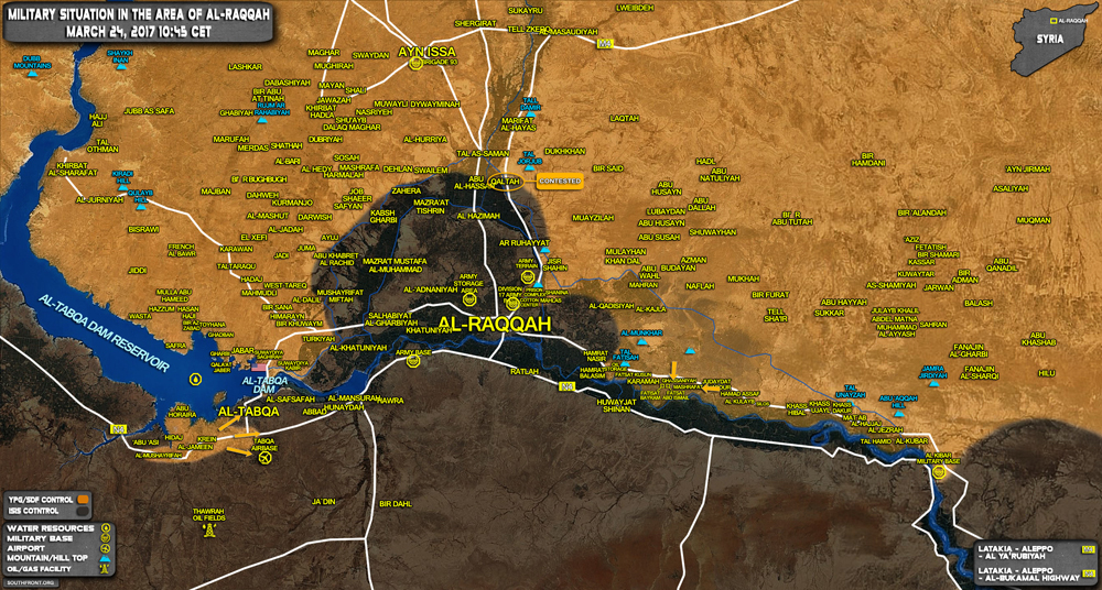 Por otra parte, el jueves 23, EEUU anunció que las SDF con su apoyo, tomaron la presa de Tabqa, al suroeste de Raqqa y en el margen sur del Éufrates. El dia de hoy se ha manifestado el grupo terrorista DAESH a través de su agencia de difusión (Amaq), desmintiendo los reportes de las SDF y la coalición occidental que las apoya.