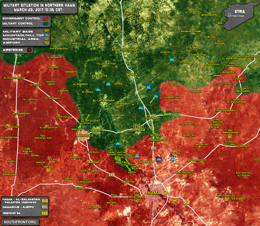 Mismo destino tuvieron las villas de Balhassin, Arzeh y Talat Al Shiha, seguidas de un peligroso movimiento terrorista hacia Qamhana y el Aeropuerto Militar de Hama.
