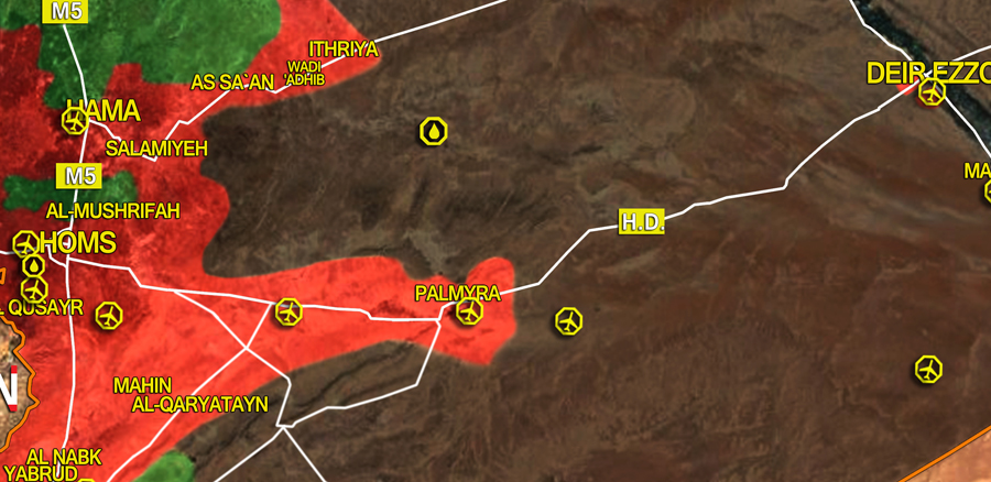 ► Prov. de Homs: las tropas leales continuaron exitosamente esta semana su operación de ampliación alrededor de la recuperada Palmira, tras su re-liberación el jueves 2, hacia el este, sur y norte de Palmira.