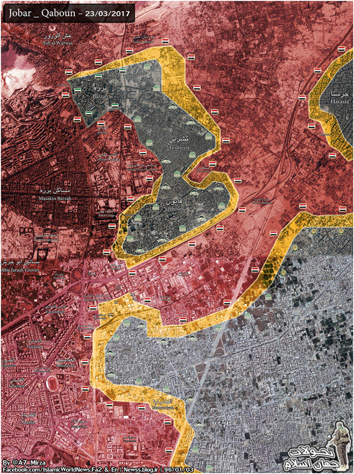 Los terroristas lanzaron una avanzada el domingo 19, buscando quebrar el cerco leal sobre el barrio de Qabún, en pos de reconectarlo con Jobar, en una operación que ha sido neutralizada por el EAS.