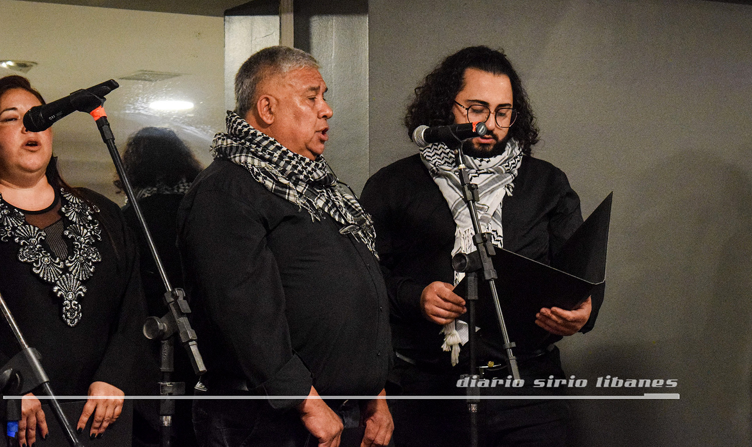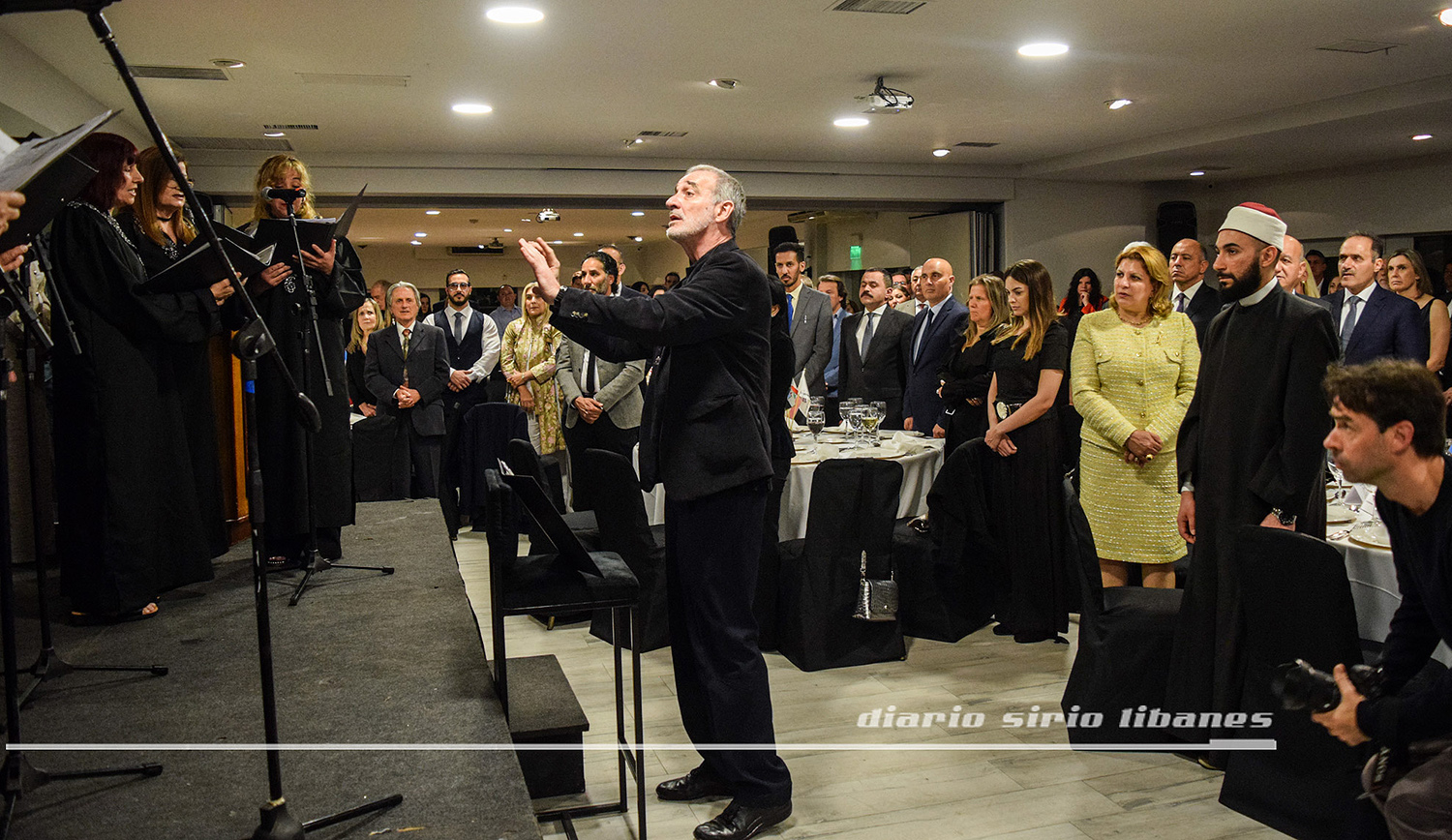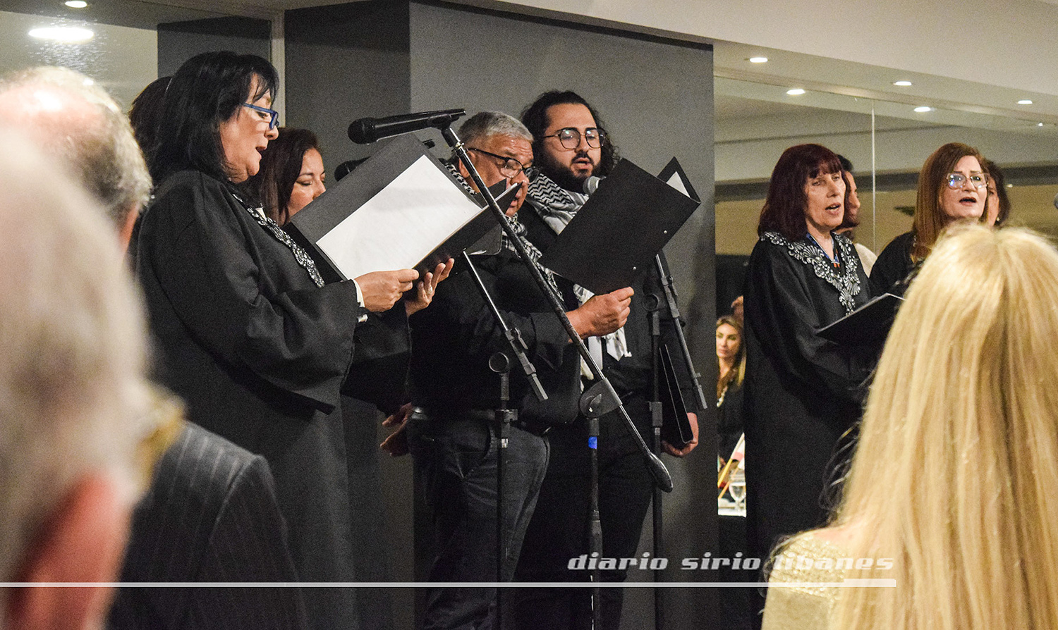 Hacia las 21 hs, con todos los invitados ubicados en el Salón Eliana Melhem y tras la lectura de autoridades presentes, tuvo lugar la entonación de los himnos nacionales de Argentina, Siria, Líbano y Palestina. Todos ellos a cargo del Coro Voces de Oriente de la Sociedad Sirio Libanesa de Córdoba, dirigido por el maestro Tristán Malbrán.
